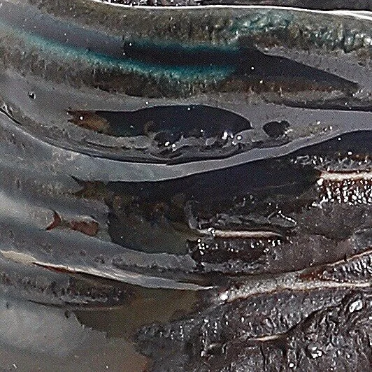Where the deep blue translucent glaze sat on the deep red clay, the resultant combination appeared gloriously alive and unfathomable. This approach saw different wavelengths of light being absorbed by the glaze, than those absorbed by the clay body, leaving a mercurial onyx black, playing from warm to cool.