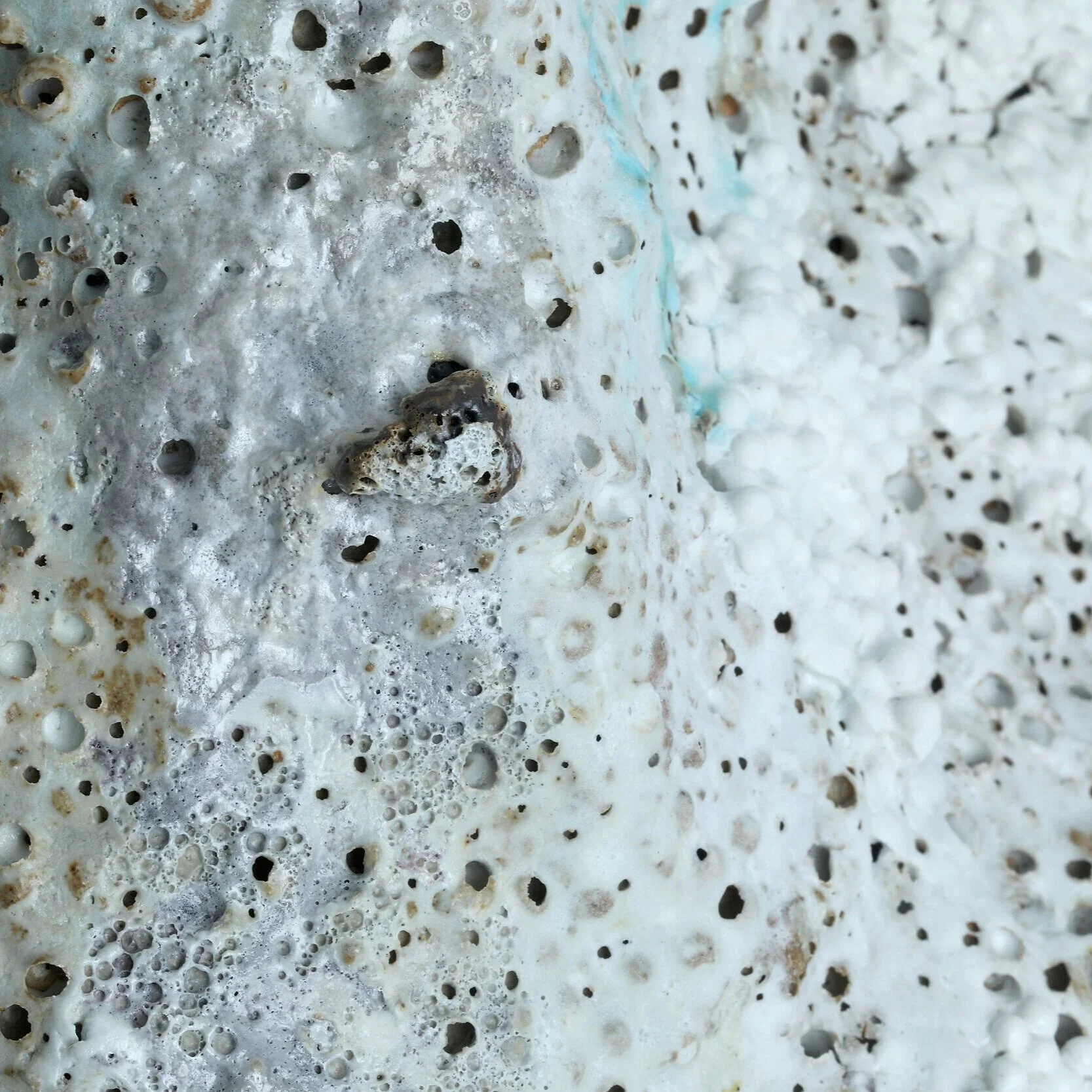 Fired multiple times to over 1280 centigrade the clay and glazes merge to reveal a pumice-like structure; light-weight and foamed, fizzing almost.